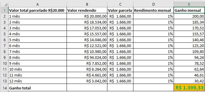 Simulação carro parcelado: R$20.000 em 12x sem juros.