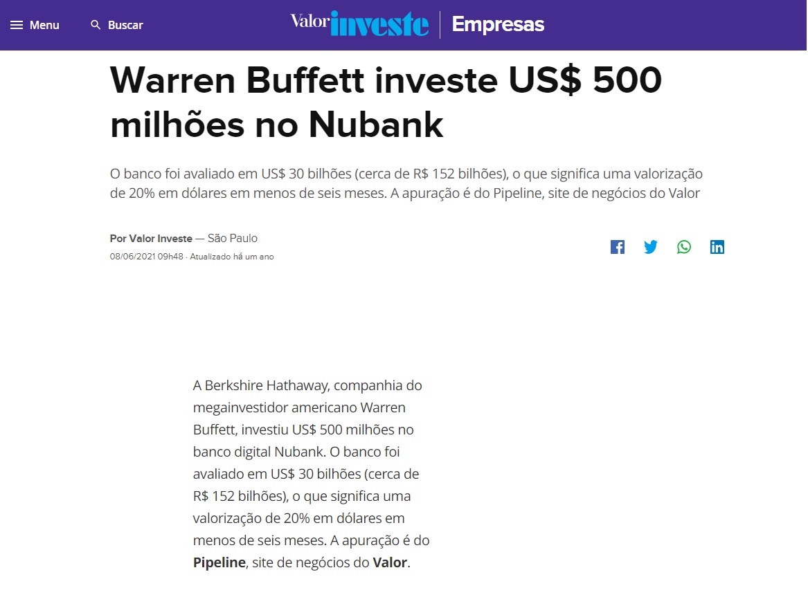O Warrent Buffet já via potencial na Nubank e em 2021 investiu investiu U$500 milhões e agora já chegou a U$1Bilhão.