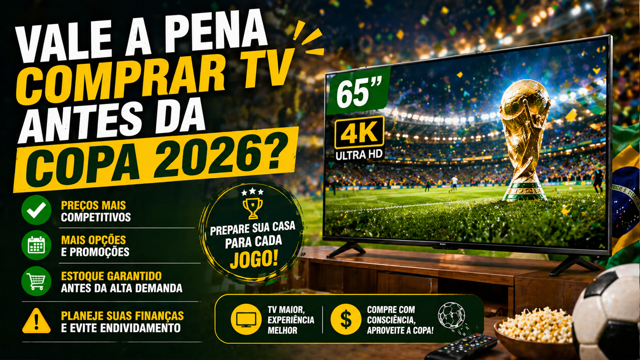 A Copa do Mundo de 2026 ainda nem comeou, mas o varejo brasileiro j est se aquecendo como jogador reserva na beira do gramado. E, desta vez, a aposta no s vender camisa verde-amarela, corneta, churrasqueira e aquele balde de pipoca que ocupa metade da sala. O grande sonho das lojas empurrar para o carrinho produtos de ticket alto: TVs de 65 polegadas, smart TVs 4K, soundbars, celulares premium e smartphones 5G.